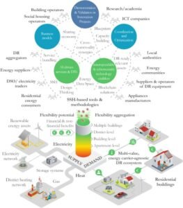 Konsep demand response pada smart grid terintegrasi dengan bangunan pintar, di mana fleksibilitas konsumsi energi dari berbagai sumber (listrik, panas, gas, penyimpanan, dan energi terbarukan) dikelola dan diagregasi pada level apartemen hingga distrik untuk menyeimbangkan supply–demand serta meningkatkan efisiensi dan manfaat ekonomi (Toderean, dkk. 2025).