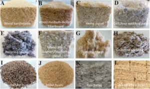 Berbagai jenis material insulasi berbasis biomassa, seperti papan kayu, serat rami, serat campuran, tekstil daur ulang, sekam, dan jerami yang dikembangkan dari limbah organik untuk aplikasi konstruksi bangunan (Lisowski & Glinicki, 2025).