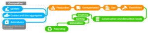 Komposisi, penggunaan, dan daur ulang beton (Wu, dkk. 225).