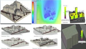 Hasil pemodelan informasi bangunan (BIM) untuk suatu kawasan, termasuk analisis aliran angin, paparan radiasi matahari kumulatif, serta simulasi bayangan pada berbagai waktu musim panas guna mengevaluasi kinerja lingkungan bangunan (Veerendra, dkk. 2025).
