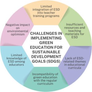 Berbagai tantangan dalam menerapkan pendidikan hijau untuk mencapai Tujuan Pembangunan Berkelanjutan (SDGs), seperti keterbatasan pelatihan guru, kurangnya sumber daya, minimnya tema ESD di kurikulum, pengetahuan pendidik yang rendah, ketidaksesuaian dengan kurikulum reguler, dan dampak negatif pada optimisme lingkungan (Akinsemolu & Onyeaka, 2025).
