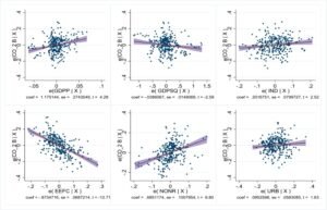 Beberapa scatter plot yang menunjukkan hubungan statistik antara berbagai variabel ekonomi dan energi (seperti PDB, industrialisasi, efisiensi energi, dan urbanisasi) dengan emisi CO₂, dimana masing-masing plot memperlihatkan arah dan kekuatan pengaruh tiap variabel terhadap emisi (Awan, dkk. 2025).