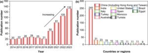 Grafik jumlah publikasi tentang daur ulang limbah fosfogypsum yang terus meningkat tajam dari 2019 hingga 2023, serta memperlihatkan bahwa China merupakan negara dengan publikasi terbanyak dibandingkan negara-negara lain (Qu, dkk. 2025).