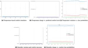 Simulasi berbasis Digital Twin yang menganalisis pengaruh perubahan suhu dan kelembapan terhadap prediksi tingkat kenyamanan termal, termasuk perubahan probabilitas tiap kelas kenyamanan saat kondisi lingkungan berubah (Almadhor, dkk. 2025).