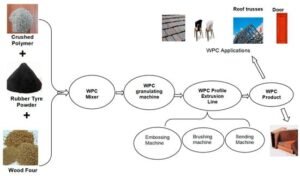 Diagram Skematik proses fabrikasi WPC menggunakan metode ekstrusi (Maake, dkk. 2025).