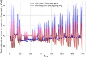 Konsumsi daya total bangunan (garis biru) dengan konsumsi daya yang diprediksi (garis merah) sepanjang waktu untuk melihat seberapa akurat model prediksi energi bekerja (Chatzikonstantinidis, dkk. 2025).