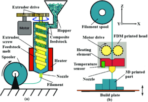 Proses ekstrusi filamen dan pencetakan 3D dengan metode FDM, di mana material dipanaskan, diekstrusi melalui nozzle, lalu disusun lapis demi lapis hingga membentuk objek 3D (Erzen, dkk. 2025).