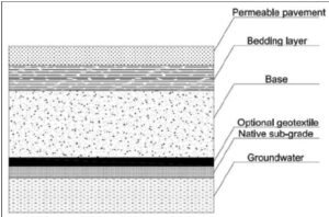 Skema lapisan perkerasan PWR yang terdiri dari lapisan permukaan berpori, bedding layer, base, geotekstil opsional, tanah dasar alami, dan berada di atas muka air tanah (Siddiqui, dkk. 2025).