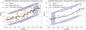 Hasil regresi LightGBM pada data training dan testing, yang membandingkan nilai aktual dengan garis prediksi model serta pita deviasi standar untuk menunjukkan tingkat ketidakpastian prediksi (Khan, dkk. 2025).