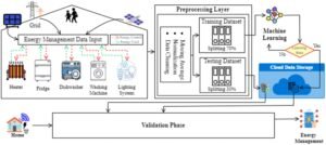 Alur sistem manajemen energi pintar di rumah, di mana data pemakaian listrik dari peralatan rumah tangga diproses dan dianalisis dengan machine learning melalui penyimpanan cloud untuk mengoptimalkan penggunaan energi (Khan, dkk. 2025).