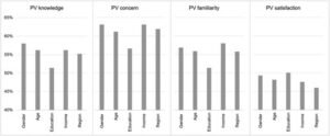 Diagram batang yang membandingkan tingkat pengetahuan, kepedulian, familiaritas, dan kepuasan masyarakat terhadap teknologi panel surya (PV) berdasarkan faktor demografis seperti jenis kelamin, usia, pendidikan, pendapatan, dan wilayah (Alnusairat & Qadourah, 2025).