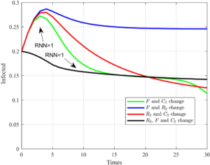 Simulasi model SEIR dengan berbagai kombinasi perubahan parameter, yang memperlihatkan bagaimana variasi parameter mempengaruhi jumlah individu terinfeksi dari waktu ke waktu (Wang & Zhu, 2025).