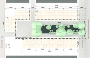 Denah kawasan permukiman dengan area penelitian luar ruang yang diapit bangunan bertingkat empat serta dilengkapi jalur pejalan kaki dan penataan pohon di ruang terbuka tengah (Wang, dkk. 2025).