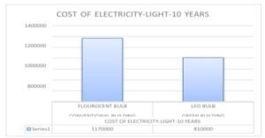 Grafik ini menunjukkan bahwa biaya listrik untuk pencahayaan selama 10 tahun pada bangunan konvensional yang menggunakan lampu fluoresen (sekitar 1.170.000) lebih tinggi dibandingkan bangunan hijau yang menggunakan lampu LED (sekitar 810.000) (Chipade, dkk. 2025).
