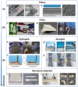 Berbagai bentuk dan aplikasi material berbasis cellulose nanofibers (CNF) mulai dari serat 1D, film 2D, hingga hidrogel, aerogel, dan material struktural 3D yang memiliki sifat mekanik, listrik, dan keberlanjutan yang unggul (Yang, dkk. 2025).