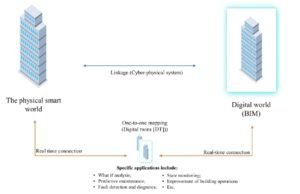 Kerangka konsep Digital Twin (DT) pada smart building, di mana bangunan fisik terhubung secara real-time dengan representasi digitalnya (BIM) dalam sistem siber-fisik untuk keperluan seperti pemantauan kondisi, analisis “what-if”, pemeliharaan prediktif, serta peningkatan operasi gedung (Ghansah, 2025).