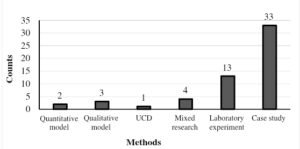 Jumlah metode penelitian yang digunakan dalam studi terpilih, di mana case study paling banyak digunakan (33 studi), disusul laboratory experiment (13 studi), sementara metode lain seperti mixed research, qualitative, quantitative, dan UCD jauh lebih sedikit (Ghansah, 2025).