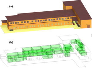 Bentuk 3D bangunan MED UETP di Pakistan beserta model analitis 3D-nya yang digunakan untuk analisis kinerja bangunan (Khan, dkk. 2025).