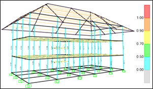Model struktur bangunan yang dianalisis dengan skema warna untuk menunjukkan tingkat kinerja atau efisiensi pada berbagai elemen bangunan dalam konteks inovasi green building (Kumara, dkk. 2025).
