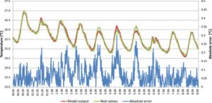 Perbandingan antara suhu hasil prediksi model dan suhu aktual dari waktu ke waktu, serta besarnya error absolutnya untuk mengevaluasi akurasi model prediksi suhu dan kelembapan pada smart building (Ambroziak & Borkowski, 2025).